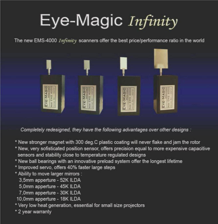 Further Advantages in LELSCAN2, X Y scanning include: Low Mass lightweight mirrors for increased scanning performance (higher definition) Frequency and Over-Drive limiting to prevent over scanning (prevention of destruction of galvos) Voltage testing prior to scan set initialization (prevention of floating voltage) ------------------------------------------------------------------------------------------------------------------------------- EMS 4000